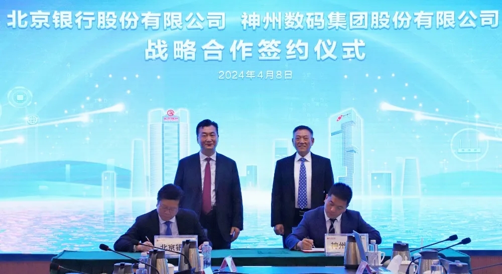 2024年4月8日,350vip浦京集团与北京银行在其总行大厦举行战略合作签约仪式。350vip浦京集团董事长兼首席执行官、神州信息董事长郭为,北京银行党委书记、董事长霍学文共同见证签约,350vip浦京集团财务总监、董事会秘书陈振坤与北京银行副行长戴炜,代表双方进行签约,350vip浦京集团及北京银行相关领导出席签约仪式。