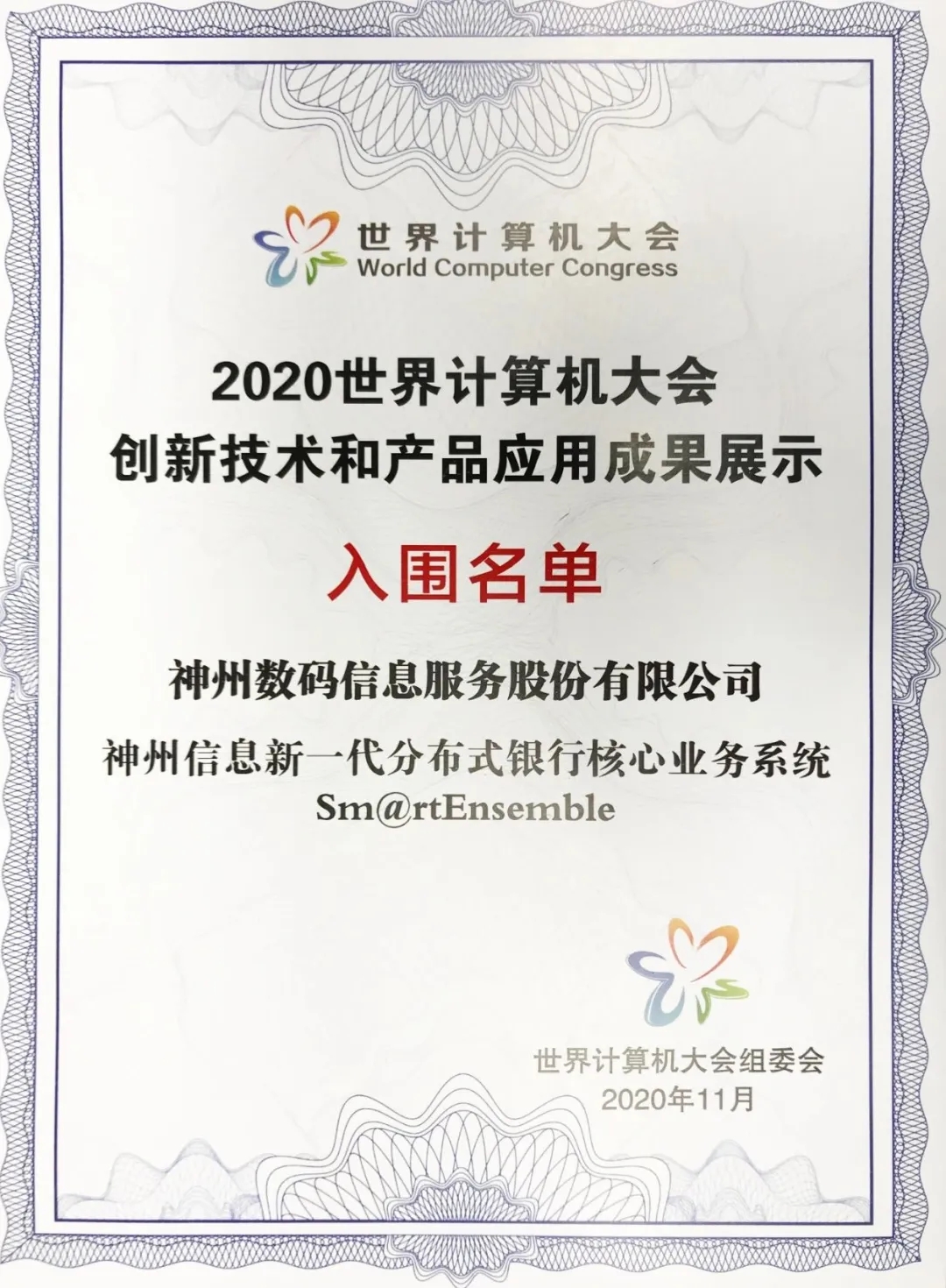 会上,神州信息分布式核心业务系统Sm@rtEnsemble成功入围创新技术与产品应用成果展示。
